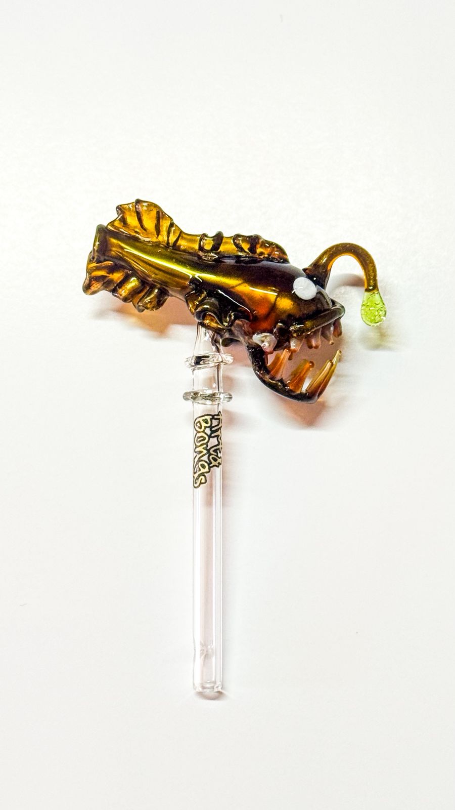 Descubra a Piteira de Vidro Artística Peixe Pescador, uma peça única feita à mão com vidro alemão de alta qualidade. Inspirada no misterioso peixe das profundezas, essa piteira possui detalhes minuciosos e o icônico ilicium que brilha na luz negra, criando um visual incrível em qualquer ambiente.